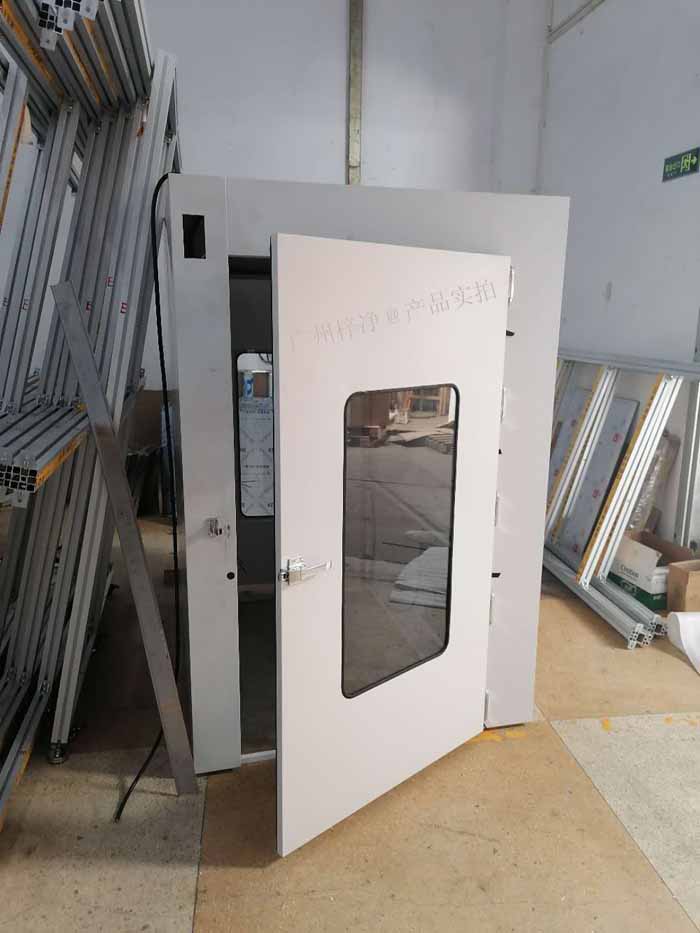 1、落地傳遞窗互鎖裝置:采用電子互鎖和機械互鎖兩種,風(fēng)淋傳遞窗同時只能打開其中一扇門;